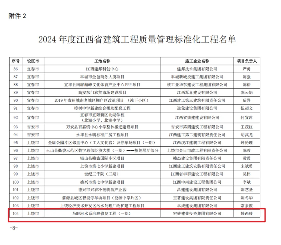 近日,宏盛建業(yè)集團(tuán)傳來捷報(bào)——由集團(tuán)承建的馬眼河水系治理修復(fù)工程(一期)榮獲2024年度江西省建筑施工安全生產(chǎn)標(biāo)準(zhǔn)化工地和建筑工程質(zhì)量管理標(biāo)準(zhǔn)化工程兩項(xiàng)殊榮。
